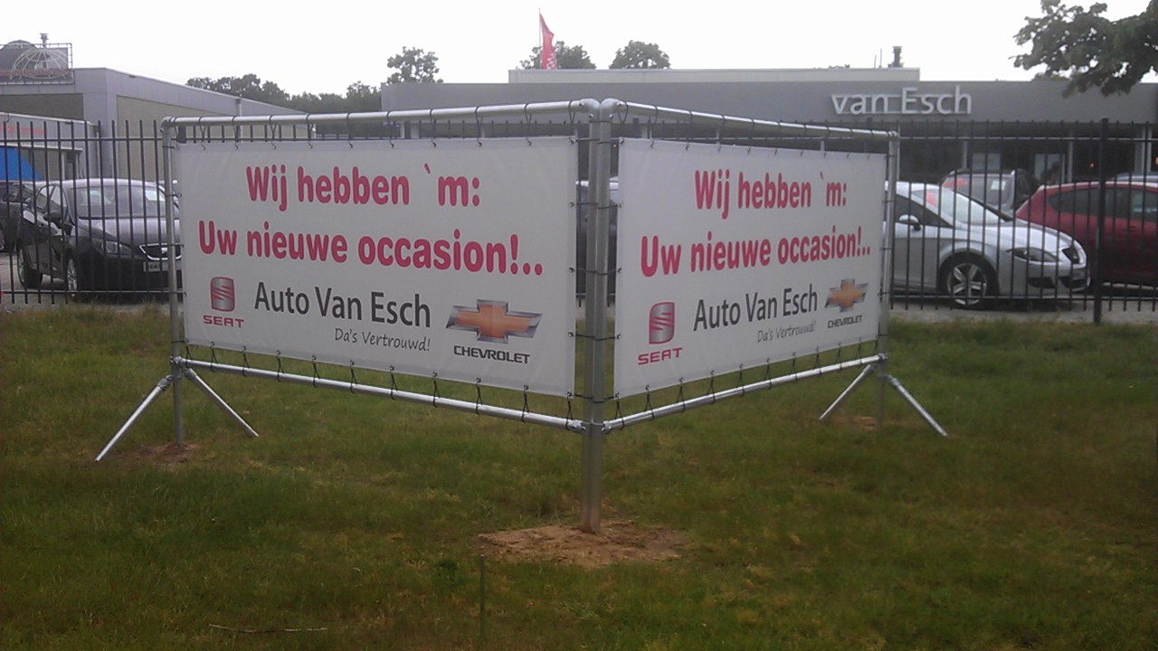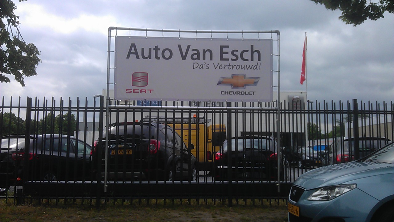 Seat-Chevrolet van Esch te Helmond is door The Sign Creator bv voorzien van spandoeken in frames.